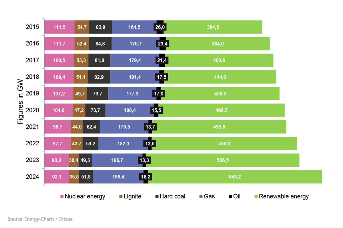 Gross capacity of power plants by energy source in the EU 2012 – 2024