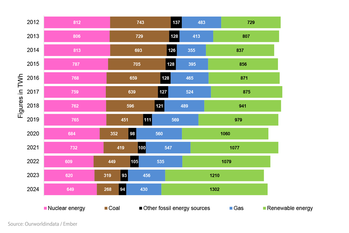 In 2024, gross electricity generation in Europe from renewable energy sources increased, mainly due to solar and wind energy. Hydropower also generated more electricity. Gross electricity generation from coal and gas has decreased, while nuclear and other fossil fuel sources have increased slightly.